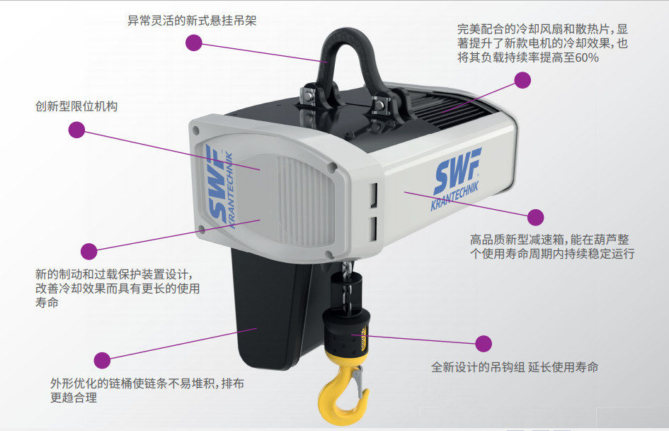 新款起升電機和全新設計的散熱片提供了更好的冷卻效果,繼而延長使用壽命。 此外,ATHLO系列頗具匠心的限位觸發(fā)機構設計新穎葫蘆 ,使 限位無論是在常規(guī)使用抑或極端條件下均能完美工作。